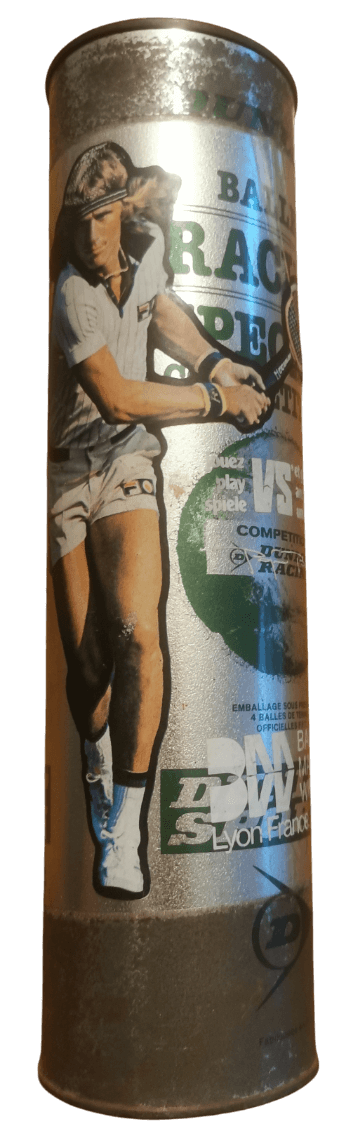 metal can from 1980s with 4 white Racing tennis ball(s)